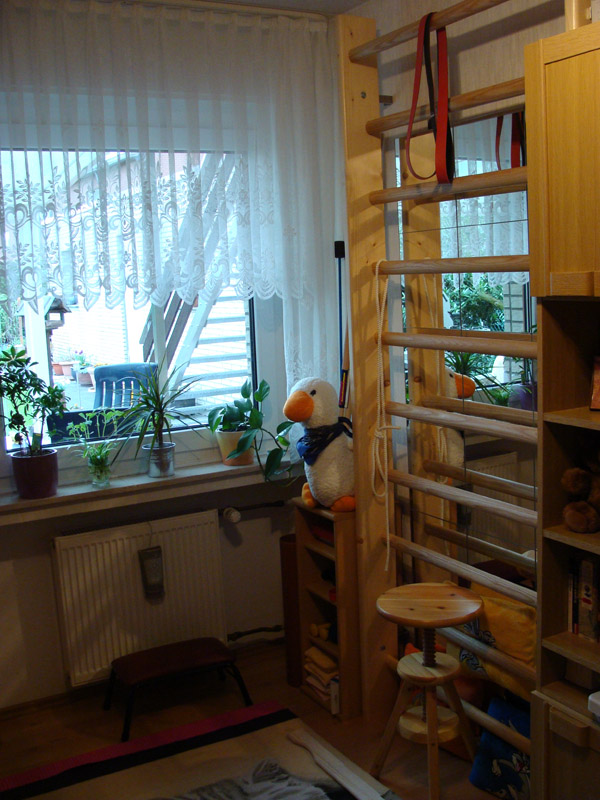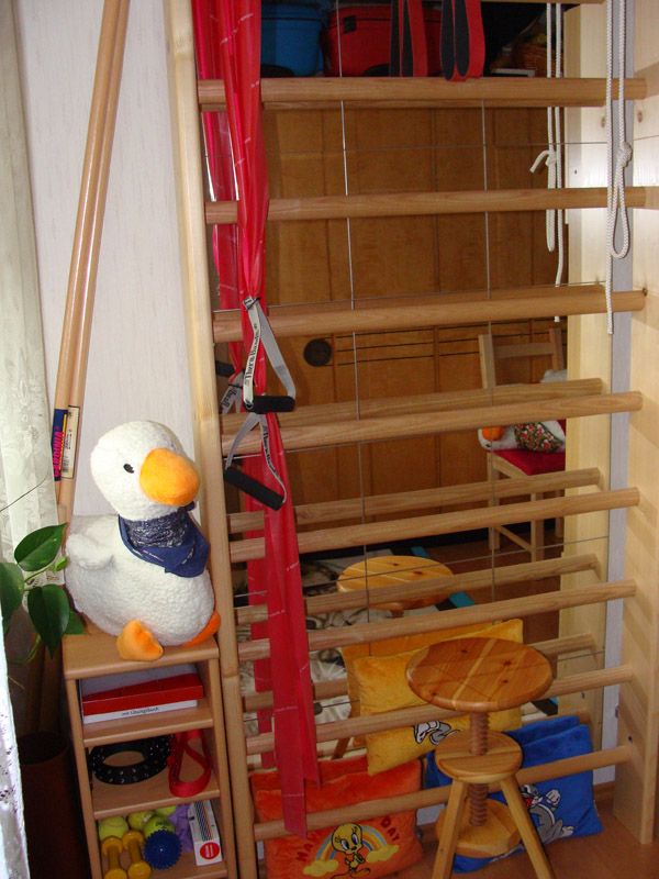 Mein ganzer Stolz ist die große Sprossenwand. Dahinter ein großer selbstgebauter Spiegel, bestehend aus Spiegelfliesen.