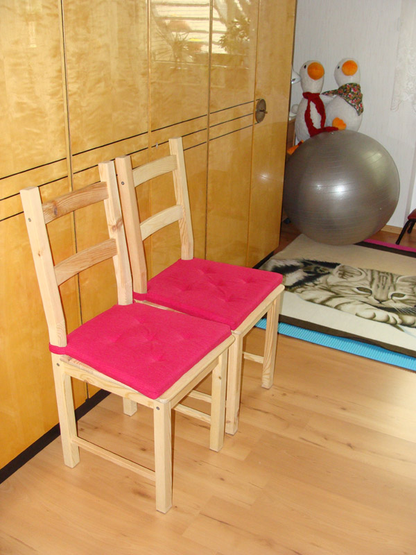 Diese beiden Holzstühle habe ich bei dem großen schwedischen Möbelhaus erstanden. Sie sind perfekt für die Übungen „zwischen zwei Stühlen“ oder den „Kutschersitz“ oder „Gegen Hohlkreuz über den Stuhl“.